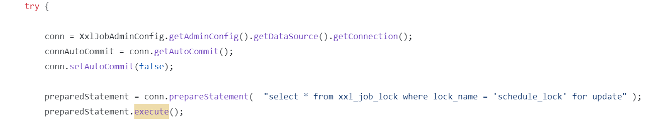 这里面的select * from xxl_job_lock where lock_name = 'schedule_lock' for update是关键,这明显是一个基于数据的悲观锁实现的一个加锁过程。