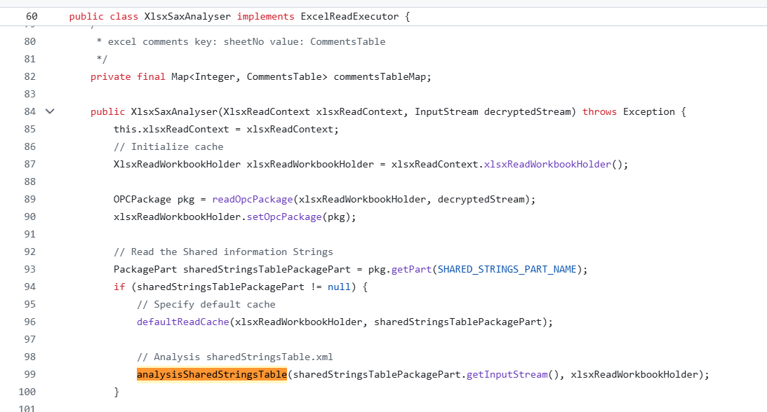 └── sharedStrings.xml # 共享字符串池(存储实际文本)而在前面说过的XlsxSaxAnalyser中我看到了和sharedStrings有关的操作,如下: