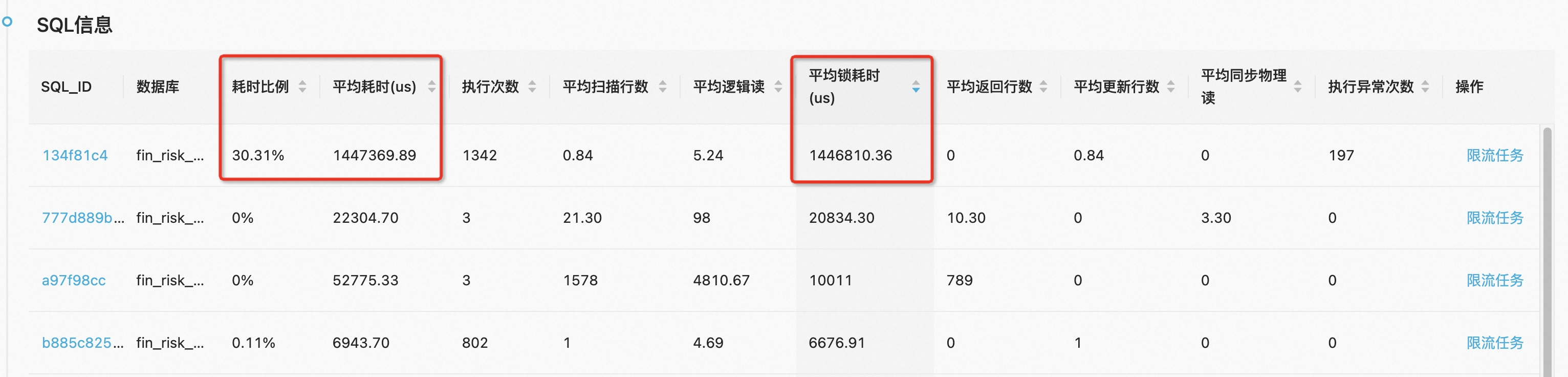 通过监控进一步查看,发现在CPU飙高的同时,有大量SQL的锁耗时比较长,平均在1.5秒左右,并且在业务高峰期经常要4s-5s: