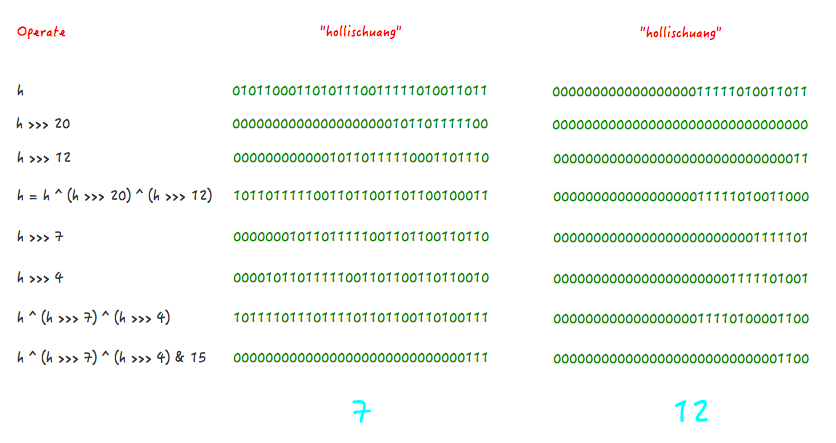 return h ^ (h >>> 7) ^ (h >>> 4);这段代码是为了对key的hashCode进行扰动计算,防止不同hashCode的高位不同但低位相同导致的hash冲突。简单点说,就是为了把高位的特征和低位的特征组合起来,降低哈希冲突的概率,也就是说,尽量做到任何一位的变化都能对最终得到的结果产生影响。