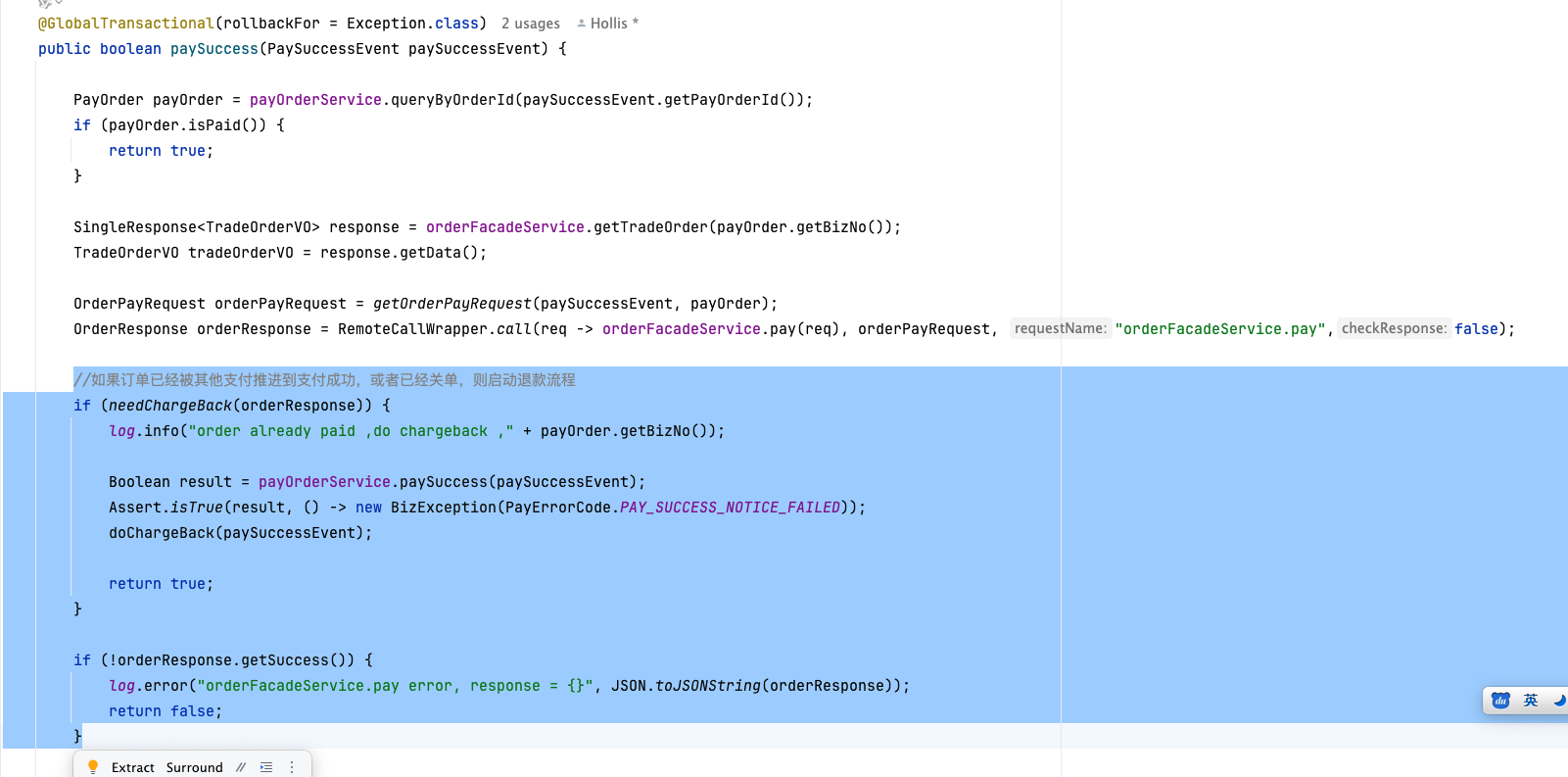 也就是说,如果orderFacadeService.pay返回的 responseCode 如果是ORDER_ALREADY_PAID或者ORDER_ALREADY_CLOSED就会执行退款。