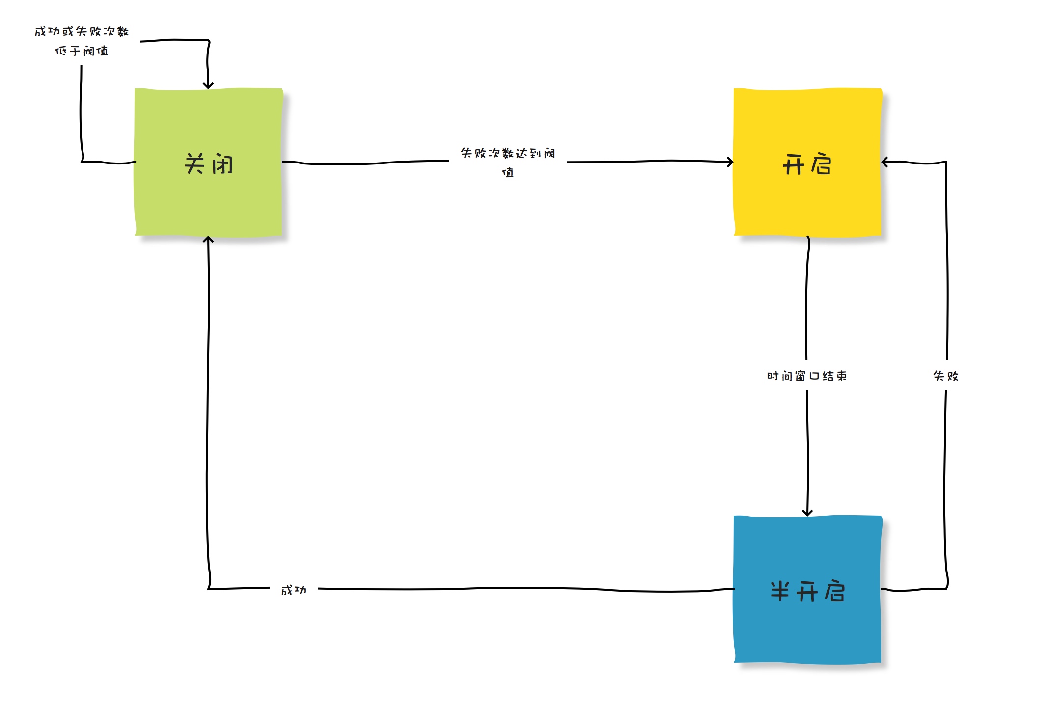 - 在此状态下断路器会允许部分的请求,如果这些请求都能成功通过,那么就意味着错误已经不存在,则会被切换回关闭状态并重置计数。倘若请求中有“任一”的错误发生,则会恢复到“开启”状态,并且重新计时,给予系统一段休息时间。