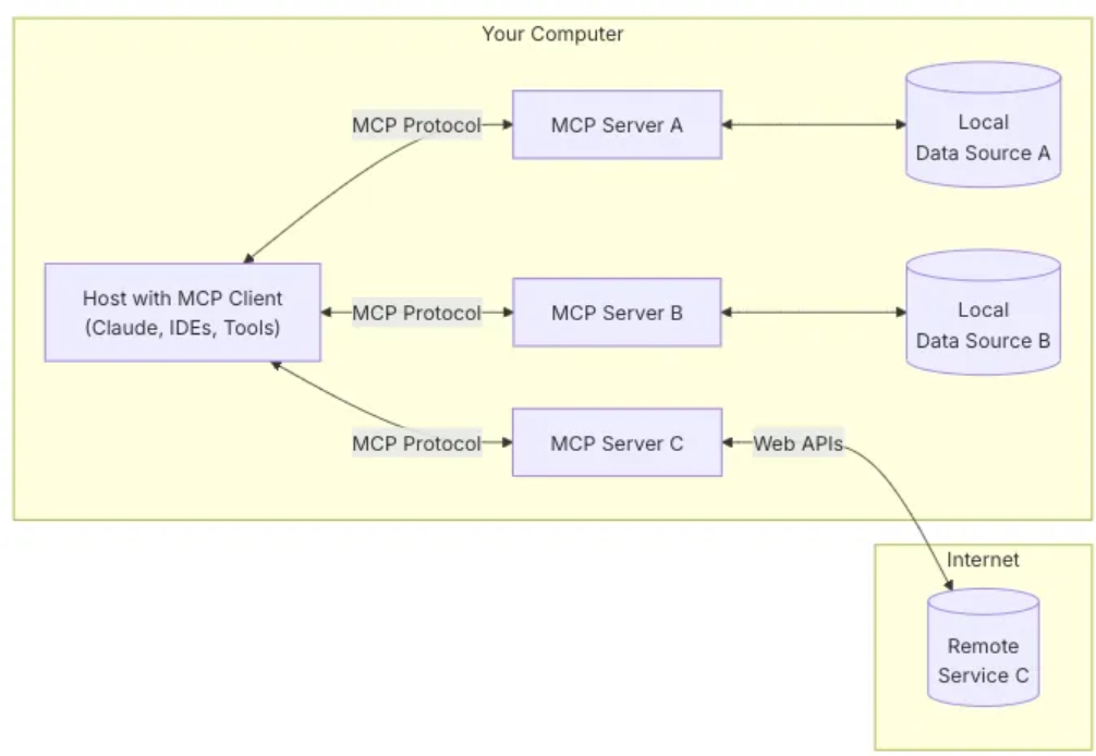 - MCP Hosts:如Claude Desktop或IDE(比如Cursor),作为AI应用的入口,发起数据请求。