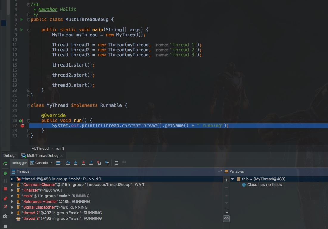 如果我们多次执行这个代码,就会发现,每一次打印的结果都不一样,三个线程的输出顺序是随机的,并且每一次debug只会进入到一个线程的执行。
