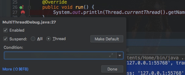 在IDEA中有一个设置,那就是当我们在断点处单击鼠标右键就会弹出一个设置对话框,当我们把其中的All 修改为 Thread之后,尝试重新执行debug代码,每一个线程都会进入到断点当中了。就实现了对多线程进行debug