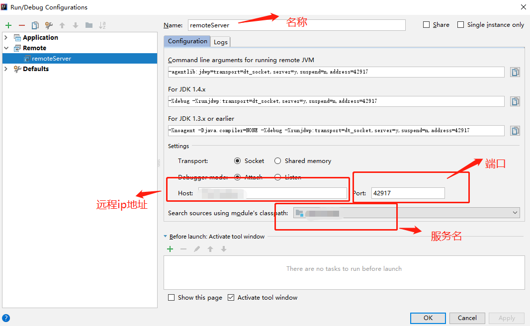 3. 在弹出的对话框中,为新配置设置一个名称,并设置远程的Host和Port