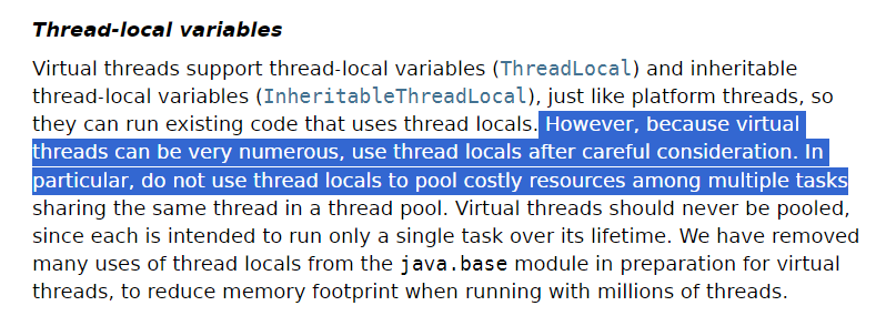在使用虚拟线程的时候,不建议使用ThreadLocal,这是JDK官网文档中提到的。