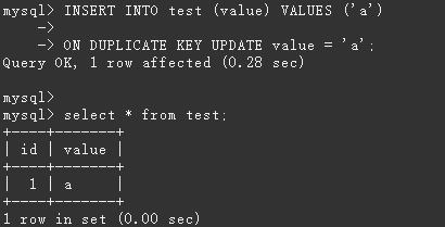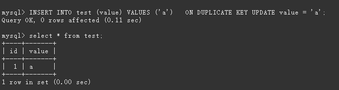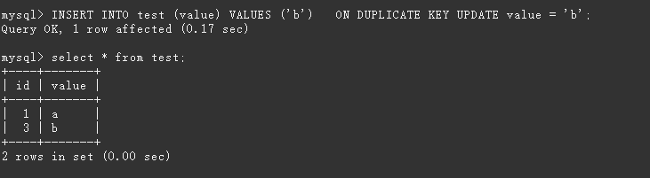 此时,由于 value 列存在唯一键约束,并且已经存在一条记录 value = 'a',所以不会插入新记录,而是会执行更新操作。但即便如此,自增主键 id 的计数器依然会增加。