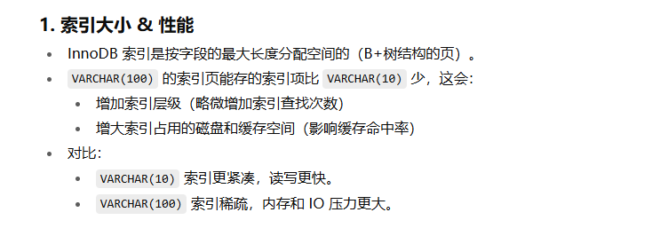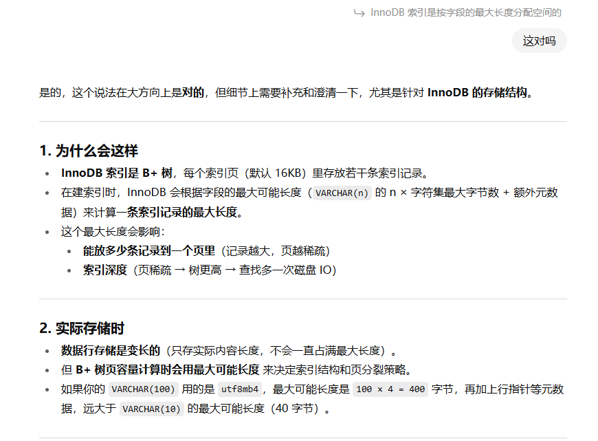 我看到有人提到过, 说varchar的长度会影响索引树的建立,说什么“~~VARCHAR(100)~~~~ 的索引页能存的索引项比 ~~VARCHAR(10)~~ 少 ~~”甚至ChatGPT也是这么说的: