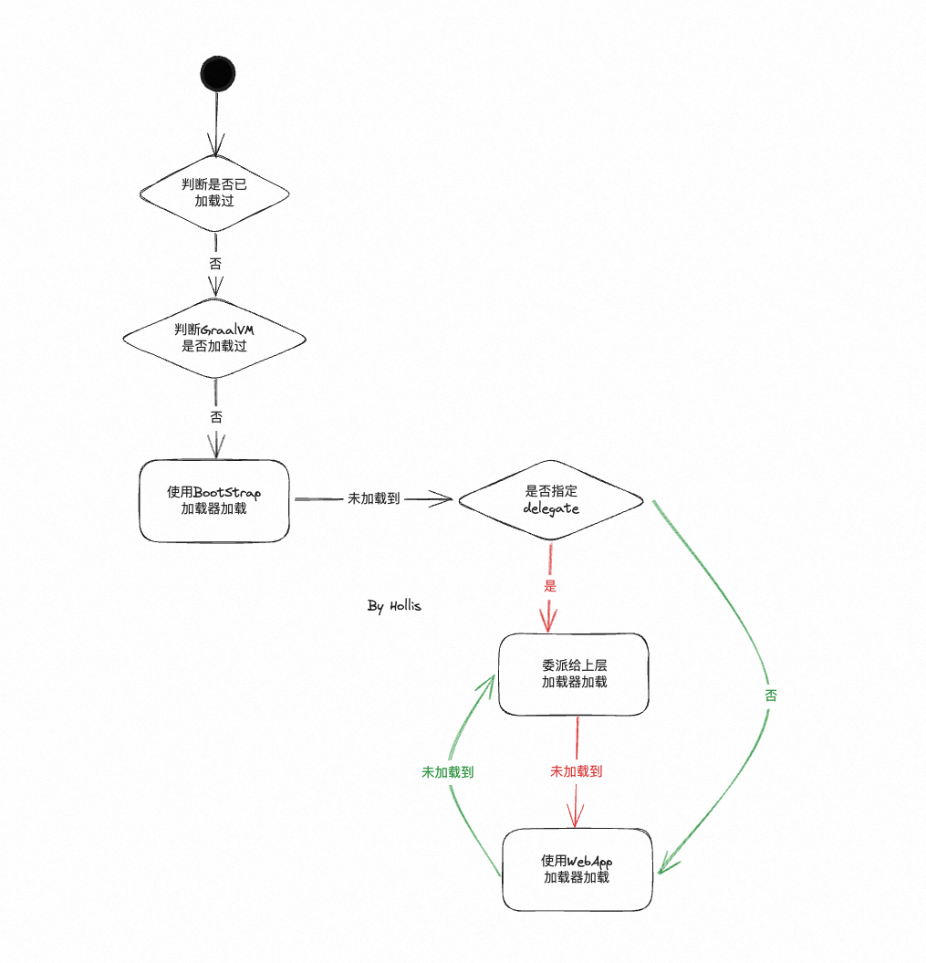 - 决定是否委派加载: 根据 delegate 属性和其他条件判断是否应该委派加载给父类加载器。